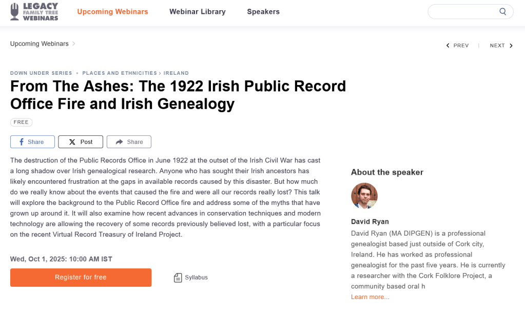 You can register for the webinar here: https://familytreewebinars.com/webinar/from-the-ashes-the-1922-irish-public-record-office-fire-and-irish-genealogy/?category=downunder.